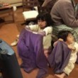 「自分で出来ないなら置いていっちゃうよー」と彩ちゃんと私は車に乗り込んでしまうと、慌てた遥は「ぎゃーーーーー」と泣き叫び、片方は靴、片方はサンダル(バーバの?)という組み合わせでこっちに来ようとしました。そして、近くに置いてあった水入り雑巾バケツにつまづいて転倒。頭からざっぷりと水をかぶってしまいました。号泣。