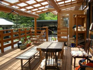 お家は去年新築してとてもキレイでした。玄関入ると、旅館??って感じの雰囲気で、隣にある藁ぶき屋根の「書院」と呼ばれる別棟とつながってして、そちらに行くと庭が見渡せるようになっていました。