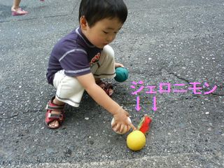 途中から、白いボールをウルトラマンジャック、緑のボールをウルトラマンタロウに見立てて、熱心に一人遊びをしていました。