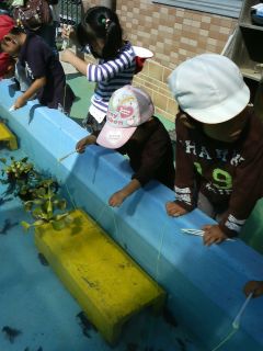 熱心にザリガニ釣り。