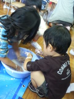 教室の中に入って、片栗粉の粘土で遊んだり・・・