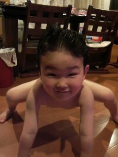 遥と元哉は、久しぶりにジージと一緒にお風呂に入りました。