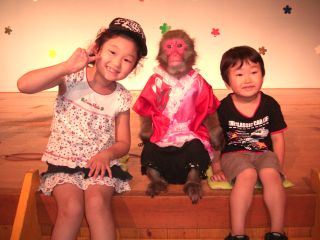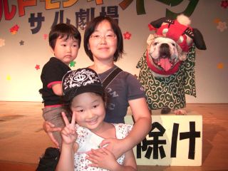 サル劇場で、獅子舞犬のオリバー君と。