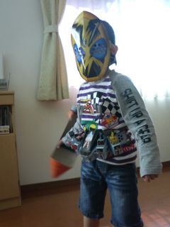 ジージの家に行って、早速、昨日作ってもらったフォーゼ変身グッズをお披露目。