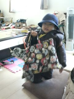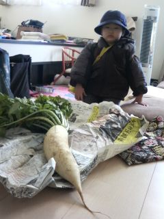 大根を包んだ新聞が、手提げバックからはみ出しています。