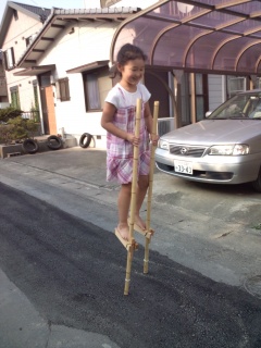 ホーム > 未分類 > 遥の竹馬 2012/07/26 投稿者:のりこ 遥さん、竹馬がとても上手になりました。 バーバに押さえてもらって・・・ こんなに高い竹馬にも乗れるようになりました!! 一輪車にあっという間に挫折しちゃったのにね~。 ジージが一生懸命作ってくれた竹馬が無駄にならなくてよかったです。 未分類